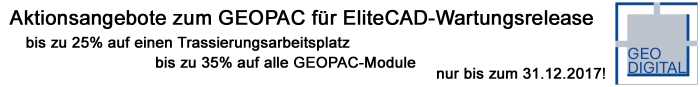 Angebote zum GEOPAC für EliteCAD-Wartungsrelease 2017Wie bereits in der letzten Newsletterausgabe erwähnt, möchten wir an dieser Stelle noch einmal auf unsere aktuellen, zeitlich bis zum Jahresende befristeten, Aktionsangebote im Rahmen des Releasewechsel auf die neue GEOPAC für EliteCAD-Version 14 hinweisen. Diese beinhalten neben lukrativen Konditionen für Test- und Mietstellungen insbesondere bis zu 25% Preisnachlass auf einen vollständig ausgestatteten GEOPAC für EliteCAD-Trassierungsarbeitsplatz sowie bis zu 35% Rabatt auf alle GEOPAC-Einzelmodule. Bitte fordern Sie per E-Mail oder unter der Rufnummer 0211 522883-0 ein auf Ihre Bedarfe individuell zusammengestelltes und unverbindliches Informationsangebot an. Bei weiteren Fragen zu diesem Thema wenden Sie sich gerne an uns. Sie erreichen uns unter der Rufnummer +49 211 522883-0 oder schreiben Sie uns einfach eine formlose E-Mail. |