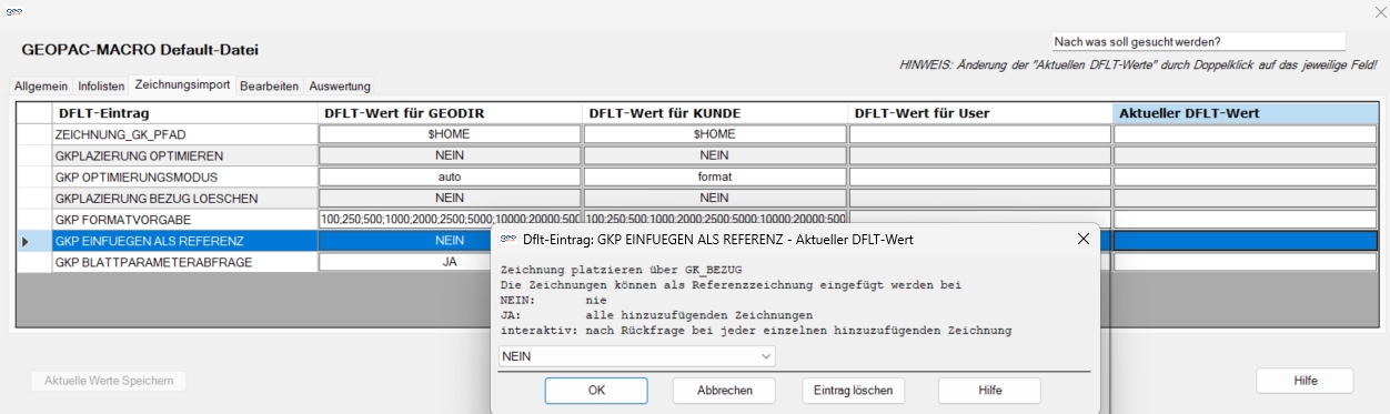 Über den Menüpunkt "Einstellungen" und dem Untermenüpunkt "DFLT-Werte zu GEOPAC-Modul" kann zuerst das gewünschte Programm gewählt werden. Die einzelnen zugehörigen Funktionsgruppen sind dabei in unterschiedlichen Reitern zusammengestellt. Die integrierte Suchfunktion oben rechts in der Bildschirmmaske unterstützt Sie übrigens bei der Suche nach dem gewünschten DFLT-Eintrag. In dem im nachstehenden Screenshot dargestellten Beispiel wird für die aktuelle GEOPAC für ELITECAD-Sitzung die Standard-Einstellung für das Positionieren einer Zeichnung über den GK geändert. Die Dialoge ändern sich jeweils nach den Eingabemöglichkeiten und werden nach Bestätigung in der rechten Spalte angezeigt. Bei weiteren Fragen zu diesem Thema wenden Sie sich gerne an uns. Sie erreichen uns unter der Rufnummer +49 211 522883-0 oder schreiben Sie uns einfach eine formlose E-Mail. Um diesen Newsletter auch zukünftig interessant und bedarfsgerecht anbieten zu können, bitten wir Sie um Ihre Unterstützung. Haben Sie interessante auch für andere Anwender hilfreiche Hinweise oder Tipps & Tricks parat, pfiffige Makros entwickelt oder kniffelige Probleme gelöst, dann lassen Sie uns diese bitte mit einigen erläuternden Worten zukommen. Jeder auf dieser Basis veröffentlichte Beitrag wird von uns honoriert - lassen Sie sich überraschen! |